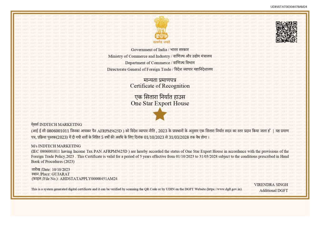 This certificate, issued by the Directorate General of Foreign Trade (DGFT) under the Ministry of Commerce & Industry, Government of India, officially recognises us, INDTECH MARKETING as a One Star Export House. The status is awarded in accordance with the Foreign Trade Policy 2023, acknowledging the company’s exceptional export performance and adherence to prescribed trade regulations.
